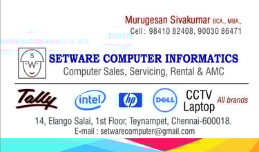We are Setware Computer Informatics,Inc., GST 33AKTPS3033J1ZU a computer service company providing Computer Sales, Servicing, Rental, AMC, Repair, Networking, Virus Removal, Spy ware Removal, and many other computer related Services.Setware Computer Informatics, Inc. can provide you with all the necessary support to run your day-to-day business. Centrally located in Chennai, we provide support and service to all Over India,.Nearly 30 years, service has paid close attention to customers' needs. We value our relationship with our customers and know that our growth depends on the satisfaction of our customers and strive to provide our esteemed clientele with state-of-the-art Computer Sales, Services and Rental